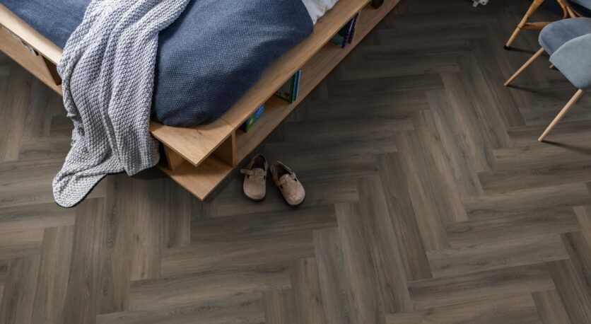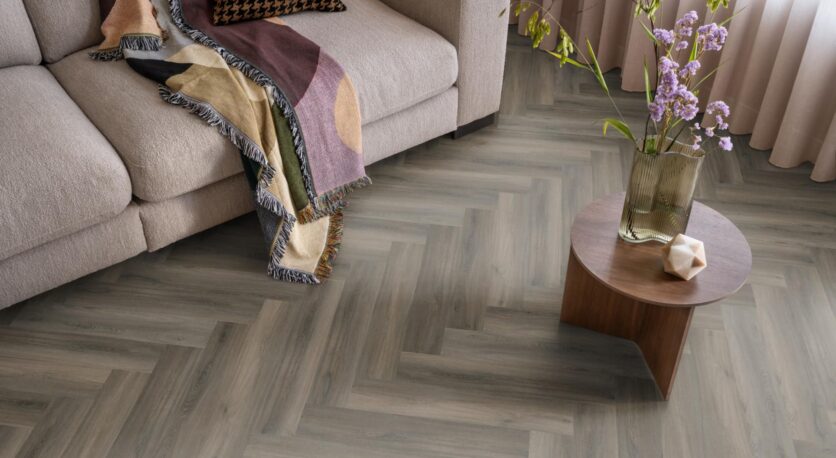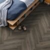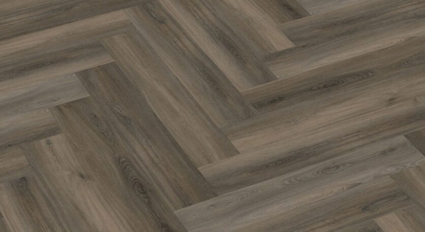 De warme en rijke uitstraling van hout is terug te vinden in deze rustige en natuurgetrouwe visgraat pvc vloer. Deze visgraat pvc vloer is verkrijgbaar in zes kleuren, variërend van beige tot donkergrijs. Voor elk interieur een passende kleur. De stroken zijn afgewerkt met een extra matte toplaag en hebben een dikte van 0,55 mm.