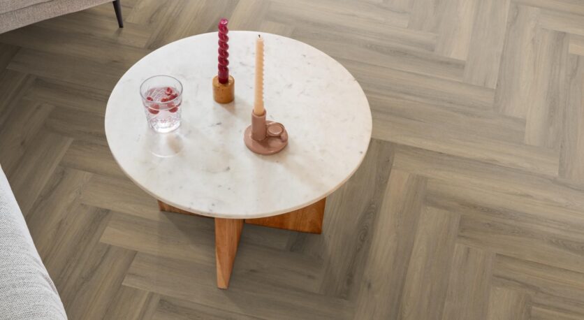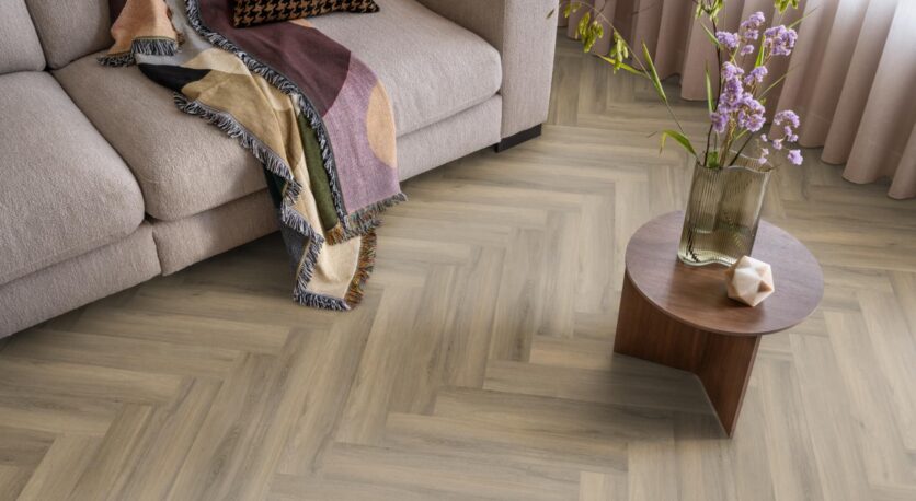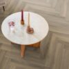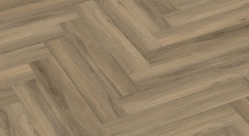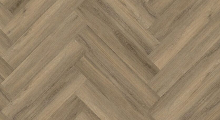 De warme en rijke uitstraling van hout is terug te vinden in deze rustige en natuurgetrouwe visgraat pvc vloer. Deze visgraat pvc vloer is verkrijgbaar in zes kleuren, variërend van beige tot donkergrijs. Voor elk interieur een passende kleur. De stroken zijn afgewerkt met een extra matte toplaag en hebben een dikte van 0,55 mm.