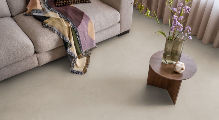 Het betonlook decor van de pvc traptreden set Ceramo is verkrijgbaar in vier kleuren. De traptreden sluiten naadloos aan bij de pvc vloer Ceramo, zodat de vloer doorgelegd kan worden op de trap.