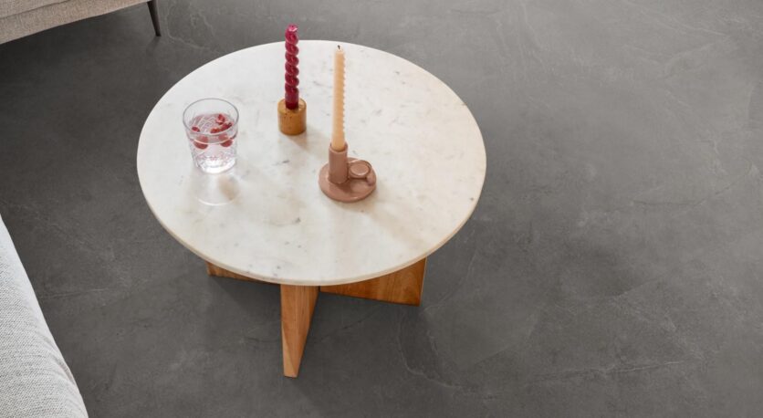 Het betonlook decor van de pvc traptreden set Ceramo is verkrijgbaar in vier kleuren. De traptreden sluiten naadloos aan bij de pvc vloer Ceramo, zodat de vloer doorgelegd kan worden op de trap.